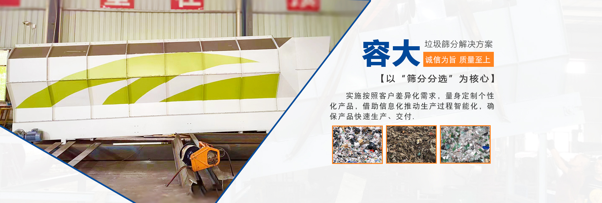 泉州容大機械有限公司是一家專研生活垃圾分選的企業(yè),以“篩分分選”為核心,實施按照客戶差異化需求,量身定制個性化產(chǎn)品,柔性化生產(chǎn)管理模式,以智能制造為主攻方向,以客戶需求為中心,借助信息化推動生產(chǎn)過程智能化,確保產(chǎn)品快速生產(chǎn)、交付。生活垃圾處理領(lǐng)域內(nèi)的技術(shù)研究,利用篩分、分選技術(shù)的核心競爭力,圍繞“智能、高效、節(jié)能、環(huán)保”八個大字為中心,為循環(huán)經(jīng)濟項下的各種生活垃圾處理項目提供成套的技術(shù)解決方案 ...